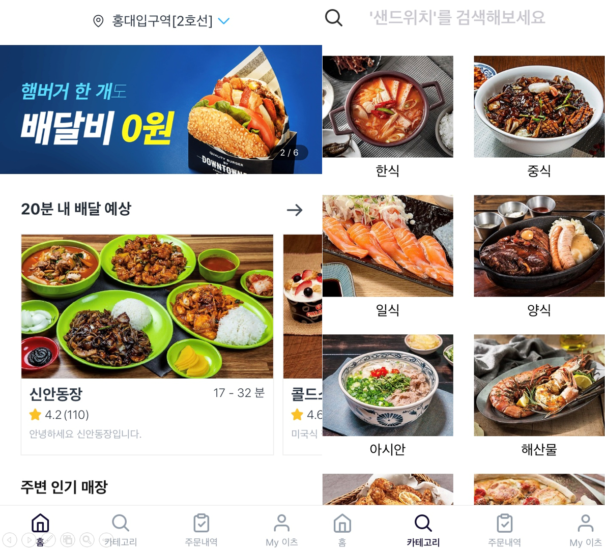 20분 내 배달이 가능한 매장을 알려주거나 카티고리 별로 들어가 매장을 검색하는 기능이 있었습니다.